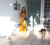 Hayden Panettiere in yellow curtain lets her puppies out